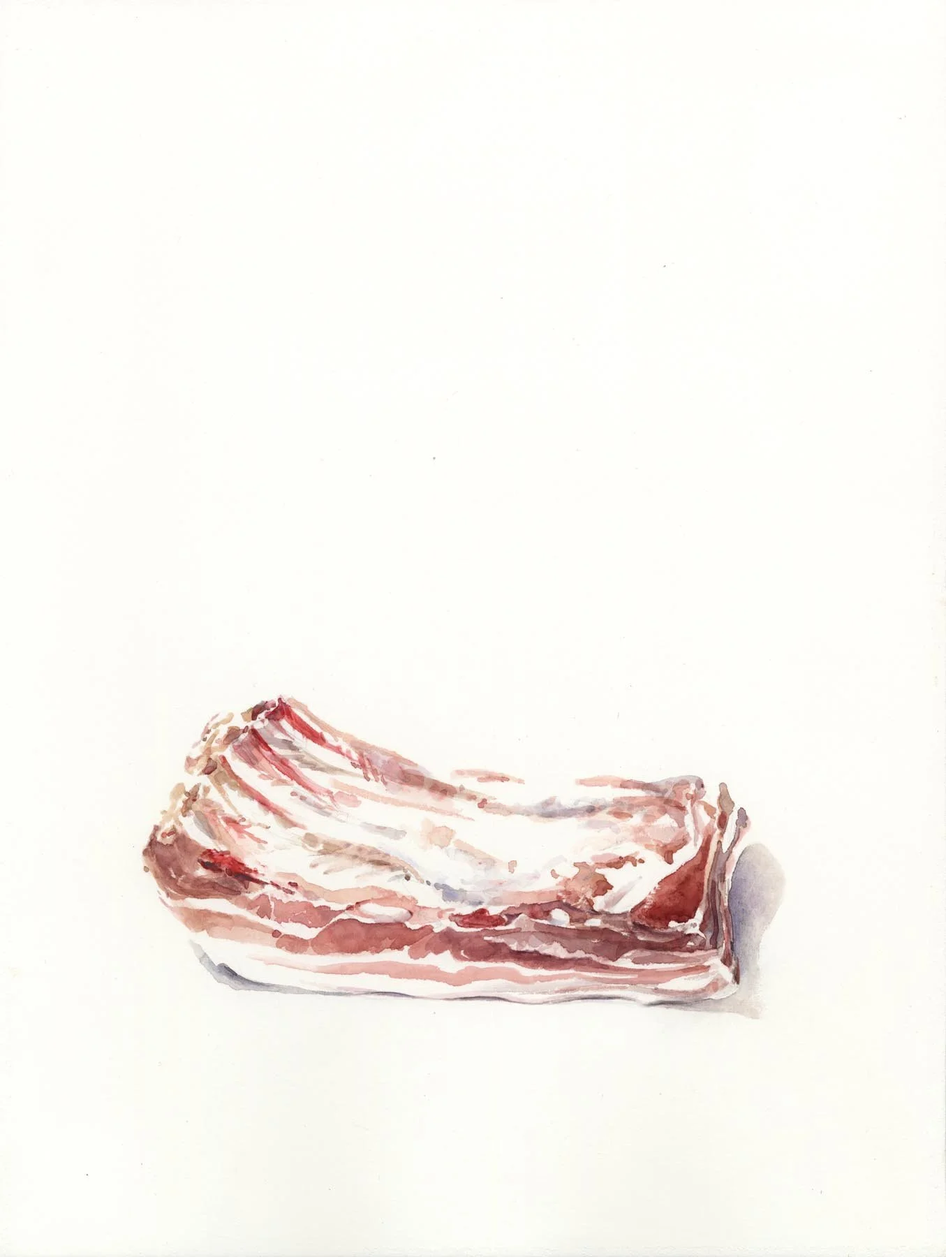 Chaque planche d’Anne-Marie Faucon confère aux pièces carnées leur individualité propre, abstraction faite de tout arrière-plan. Environnés de vide, les morceaux de viande occupent un tiers de la feuille de papier blanc ; ce dispositif déçoit par avance toute velléité symbolique, définitivement dissoute dans l’eau de l’aquarelle.